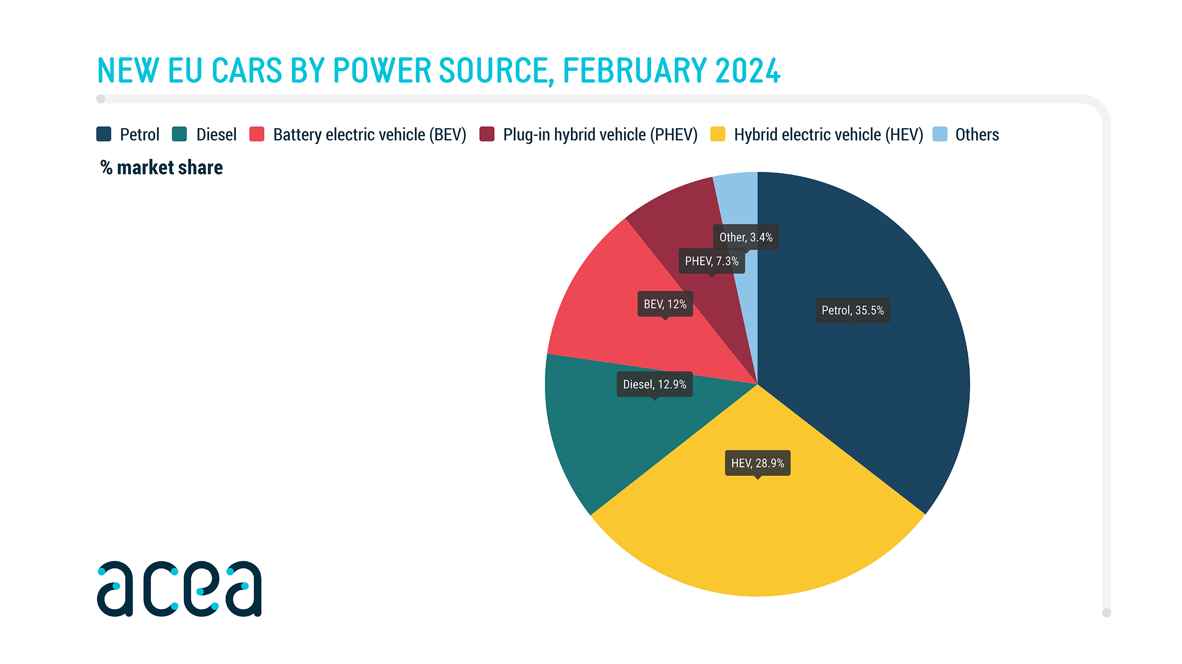 According to the figures from ACEA, the European automobile industry association, petrol-engine cars remain the top category of new auto sales, representing 35.5% of the vehicles registered in February 2024. Hybrid cars are the second-largest category, at 28.9%. Combined with plug-in hybrid cars (7.3% of the total), cars that run on liquid fuel represent 71.7% of the new vehicle registrations. Battery electric vehicles made up 12% of the total new car registrations.
