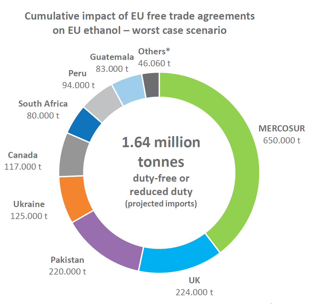 This important message should also have been sent in the recently agreed EU-Mercosur deal, which instead will allow a total volume of 650,000 tonnes of ethanol to be imported into the EU at a reduced duty (200,000 tonnes all uses) and completely duty-free (450,000 tonnes chemical uses).